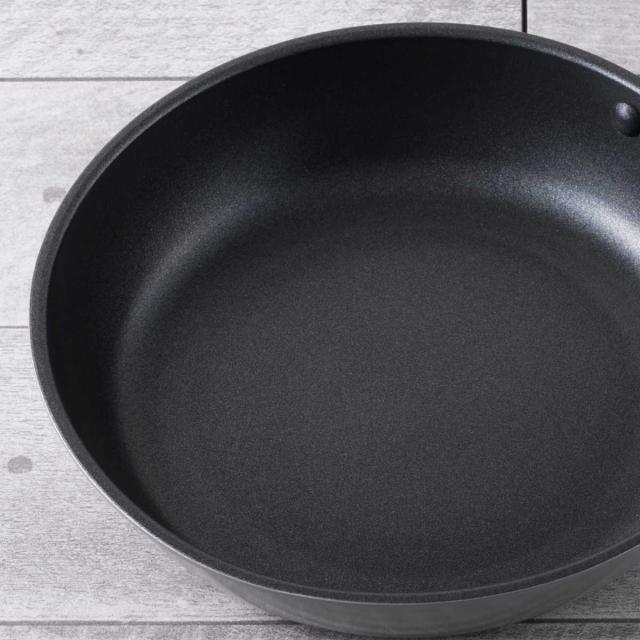 | 材質 | 本体:アルミニウム合金 貼り底:ステンレススチール 取手金具:アルミニウム合金 取っ手:フェノール樹脂(耐熱温度150度) 表面加工:内面/ふっ素樹脂塗膜加工、外面/耐熱焼付け塗装 |