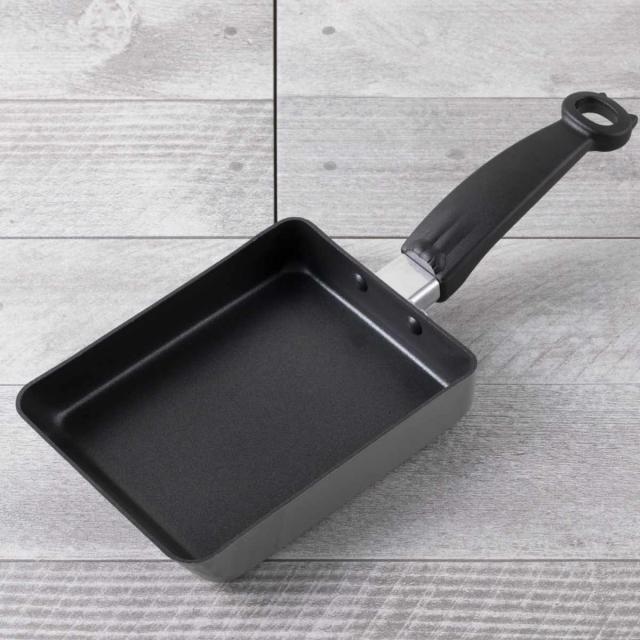 取っ手におすわりねこがデザインされた玉子焼き器です。お弁当のおかずや朝食作り、少量の炒め物にも活躍します。