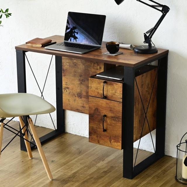 デスク 幅90cm 引出し付 レトロ調 ブルックリンスタイル ( 机 PCデスク パソコンデスク 木製 つくえ システムデスク 書斎机 コンパクト 収納 引き出し リビング )