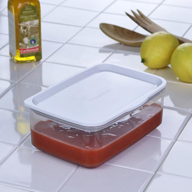 グローバルデザインのフレッシュロックコンテナは、凸凹の少ないシンプルなフォルムです、洗いやすくガラスのような美しい透明感のある本体と白いフタの組み合わせはキッチンと冷蔵庫を清潔感あふれる空間へ導きます。