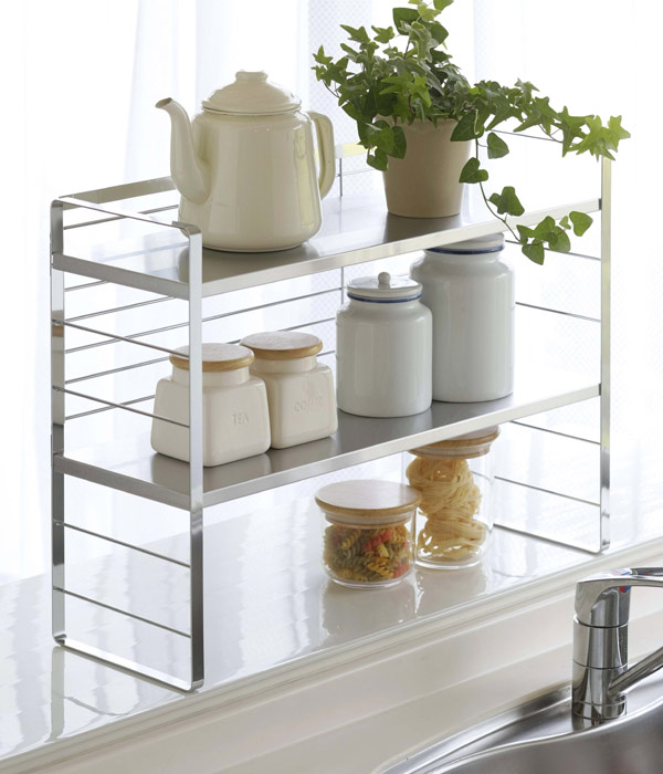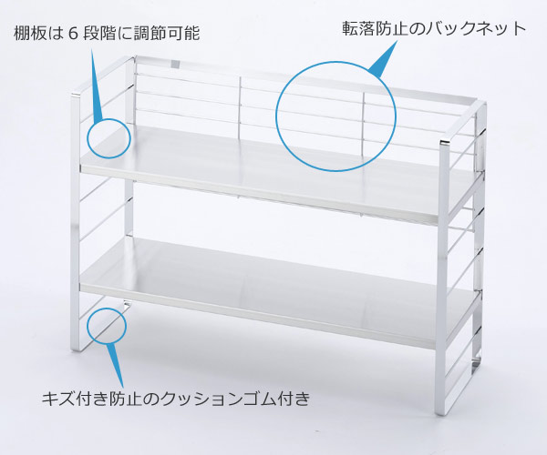 置く物の高さに合わせて、棚の高さを選べる6段階調節機能付きです。スパイスボトルなどの転落を防止するバックネット付きです。底面にはキズ付き防止のクッションゴム付きです。