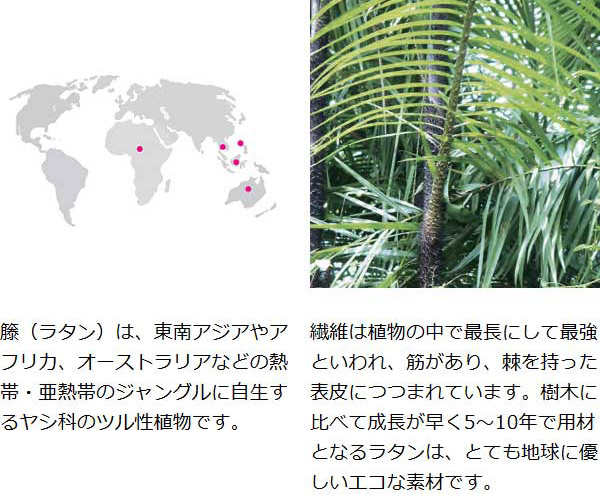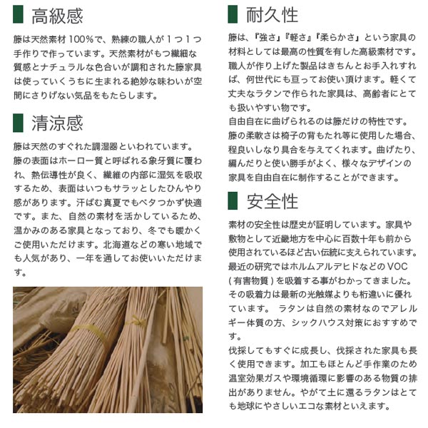 ![]() 天然素材を活かした一品 材料に皮付ラタンを使用し、自然の風合いを味わうことができます。 |