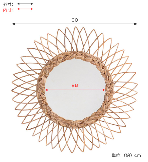 ウォールミラー 壁掛けミラー ラタン製フレーム 籐製フレーム 姿見鏡 壁掛け( 壁掛け ミラー 鏡 姿見 ラタン 籐 アジアン家具 アジアンテイスト 幾何学模様 ひまわり 太陽 サン )
