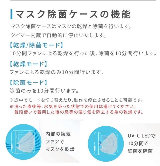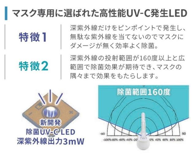 高性能UVC-(深紫外線)LEDと内蔵ファンで、マスクの乾燥と除菌を行います。