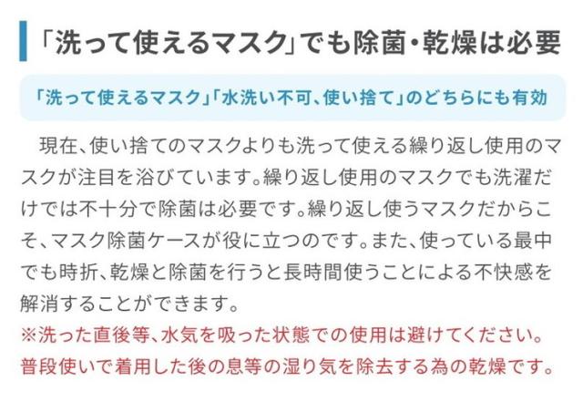 食事中等一時的にマスクを外す際、ポケットにしまうのは不衛生ですが、このケースに入れて除菌と乾燥を行えば菌の繁殖も無く再利用時の不快感が緩和されます。