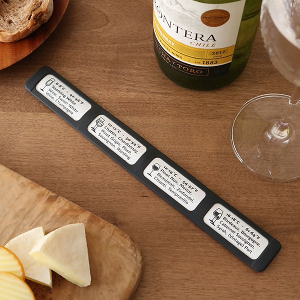 ユニークなデザインワインにくるりと巻きついて簡単にセットすることが出来ます。一般的なワインボトルに幅広く対応し、500ml用ペットボトルの温度も測ることが出来ます。 | ワインごとの最適温度が分かる本体裏側にはワインの種類と最適温度が表示されています。飲み頃の温度でワインを飲めば美味しさも格別です。 |