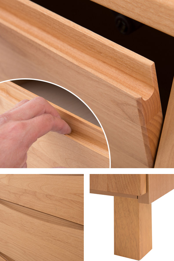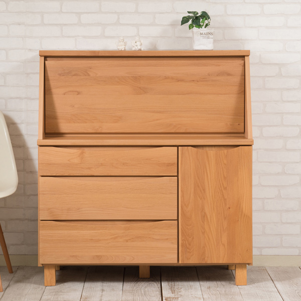 アルダー材は、反りやゆがみなどが少なく長くご使用いただけるのはもちろん木目が優しく綺麗な表情を見せるので、上品な家具によく使われている材料です。前面に取っ手を付けず、上部に掘り込み手掛け加工により高級感漂う仕上げになっております。また、脚元のボリュームのある角脚は、木材の中でも丈夫で頑丈なラバーウッドを使用しており、高級なイメージを引き立てるデザインになっています。