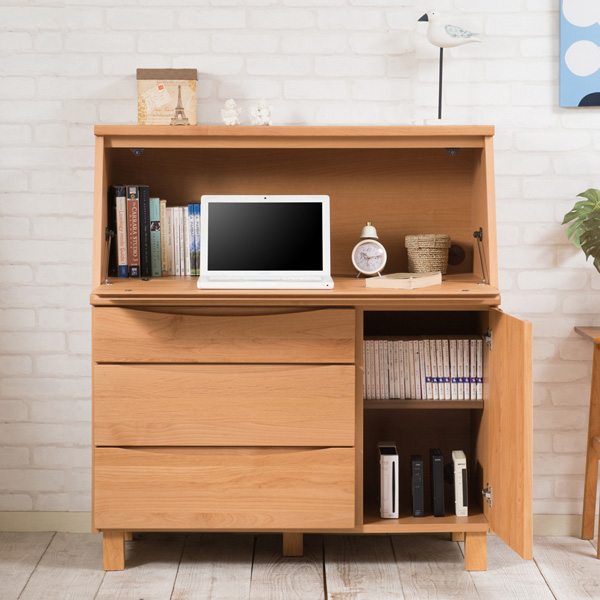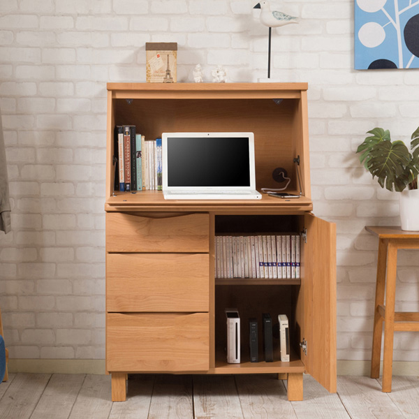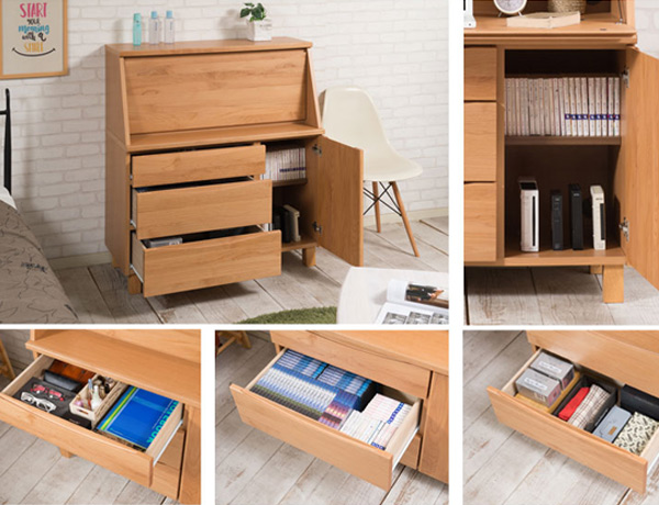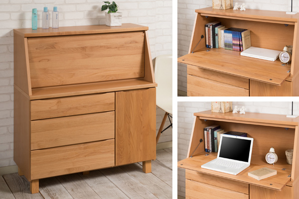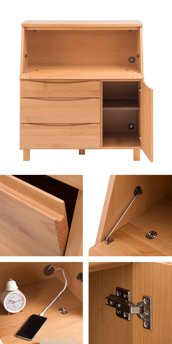 ひとつひとつが丁寧に造られているライティングデスクは、完成品でのお渡しなので組立て商品と違い丈夫でどっしり感があります。コード穴やスライド丁番も標準装備されていて使いやすくなっています。デザイン・機能・品質と三拍子そろったライティングデスクです。