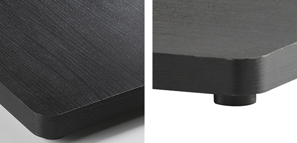 | 重厚感のある木目調の底板 シンプルかつクールなブラックグレインの底板は、重厚感や高級感を感じる仕上がりとなっています。 | アジャスターでぐらつきを軽減 底板の裏には床とのバランスを整えるためのアジャスターが付いているため、細かい調節が可能です。 |
