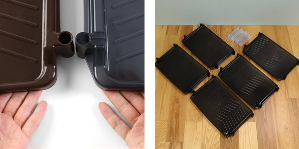 | 組み立て簡単 棚板に支柱を差し込み、支柱の位置に合わせて棚板を差し込みます。工具不要なので誰でも簡単に組み立てることができます。 | 軽量素材 プラスチック製なので、女性でも簡単に作業することができます。 |
