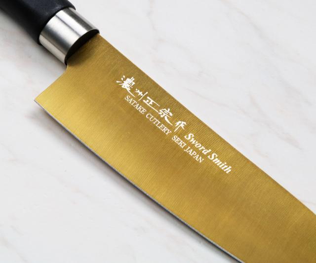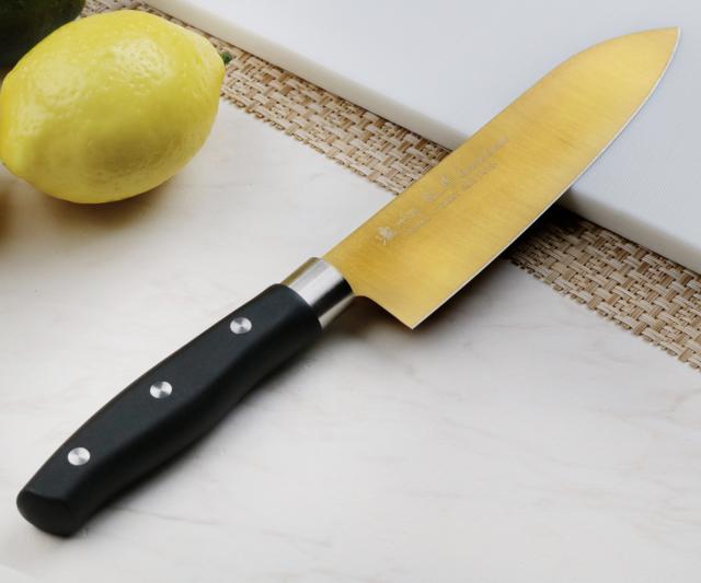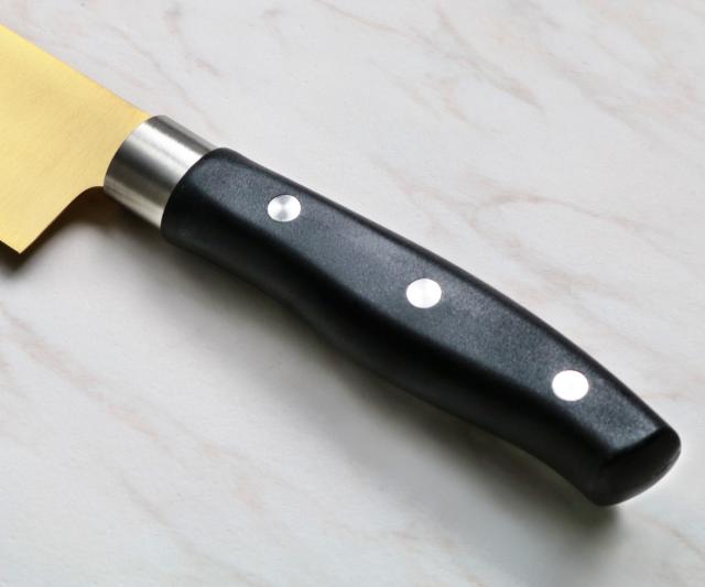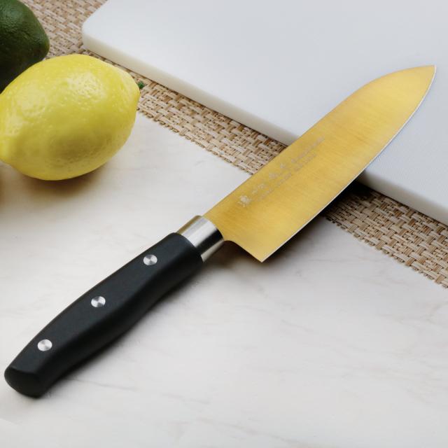チタンコーティングを施された、サビにくく丈夫な三徳包丁です。金属臭や汚れが付きにくいので衛生的です。三徳包丁は、肉・魚・野菜、何にでも使える三徳包丁で、幅広い食材に対し様々な切り方ができます。パッと目を引くゴールドは見た目にもおしゃれで、特別感があります。