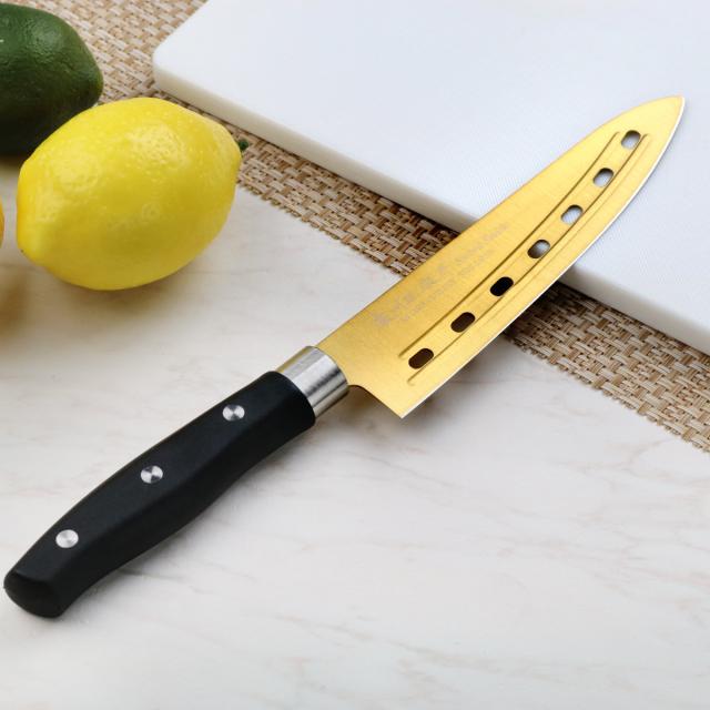 ●ゴールドチタンコーティング、穴あき三徳包丁、刃渡り18cmです。