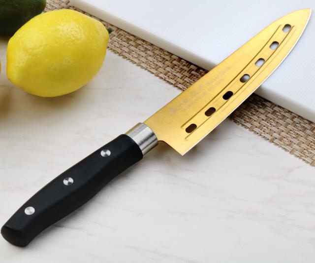 チタンコーティングを施された、サビにくく丈夫な穴あき三徳包丁です。金属臭や汚れが付きにくいので衛生的です。三徳包丁は、肉・魚・野菜、何にでも使える三徳包丁で、幅広い食材に対し様々な切り方ができます。穴あき・リブ付きなので切り離れしやすいです。パッと目を引くゴールドは見た目にもおしゃれで、特別感があります。