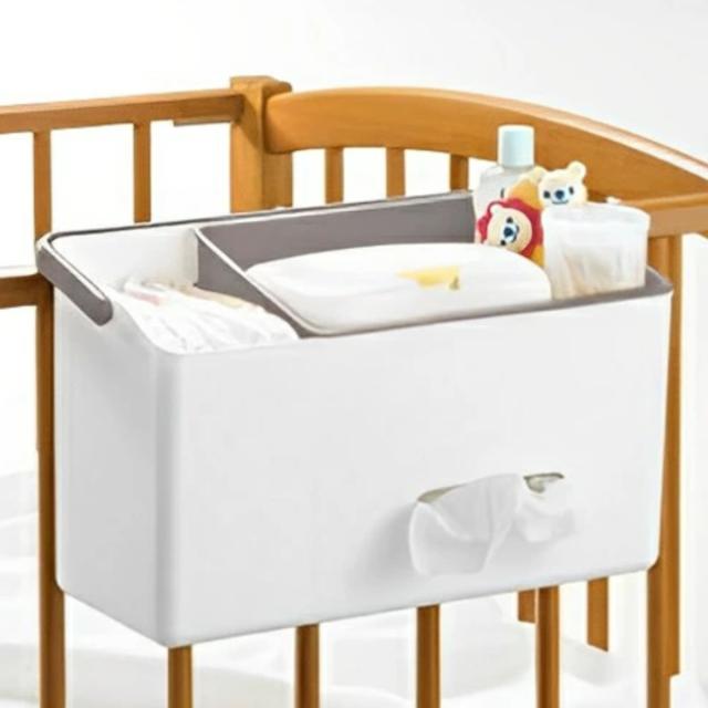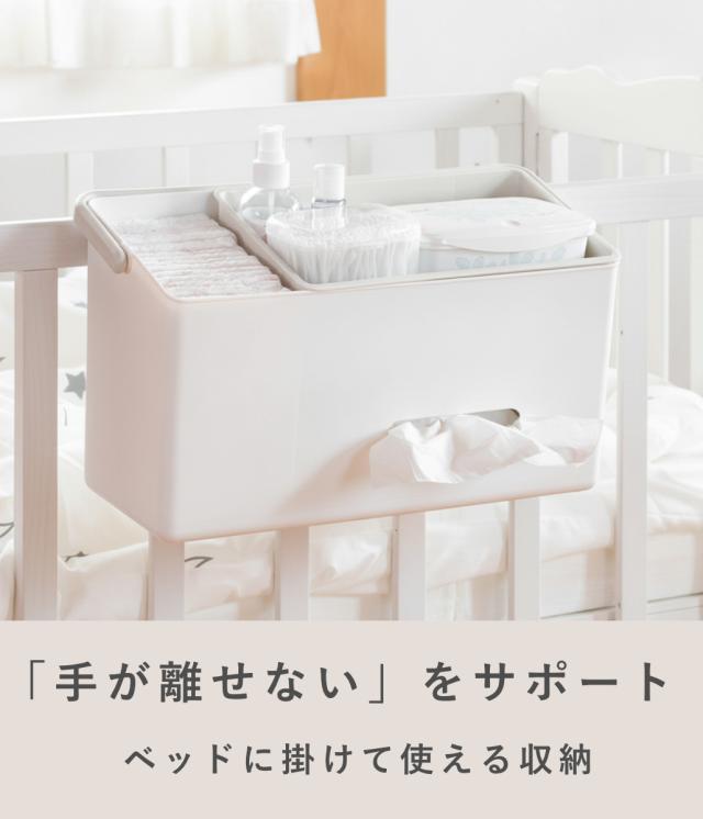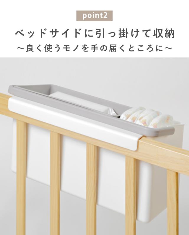 ベビーベッドなどの柵に掛けてお使いいただけます。おむつやおしり拭き、冷却シート、ベビーパウダーや体温計などの赤ちゃんのケア用品をまとめて、すぐに手の届く範囲に置いておけます。