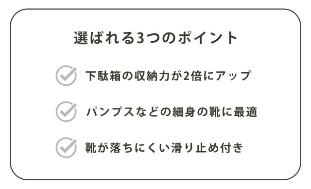 | 注意事項 | ※靴のデザインやサイズ、下駄箱によっては、ご使用いただけない場合があります ※無理なご使用は、靴の変形や製品の破損の原因となります ※商品ページ内には別の商品を含む画像を使用しています |