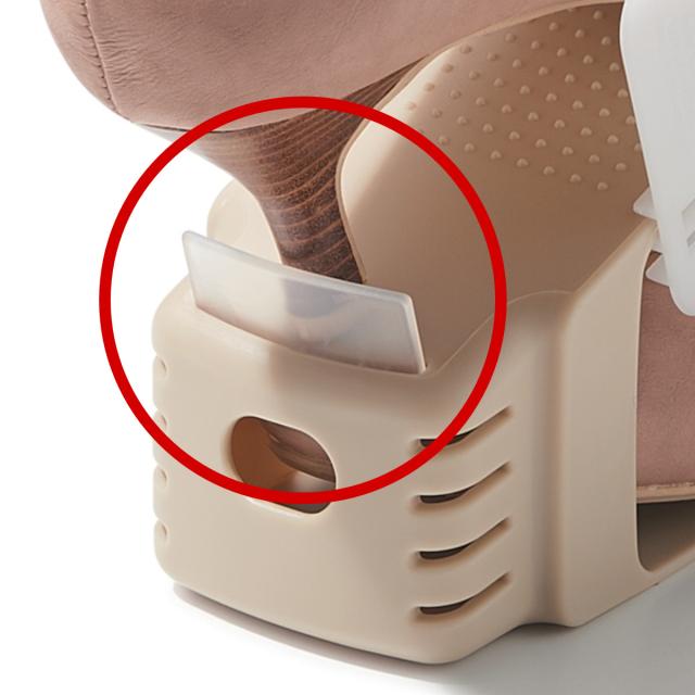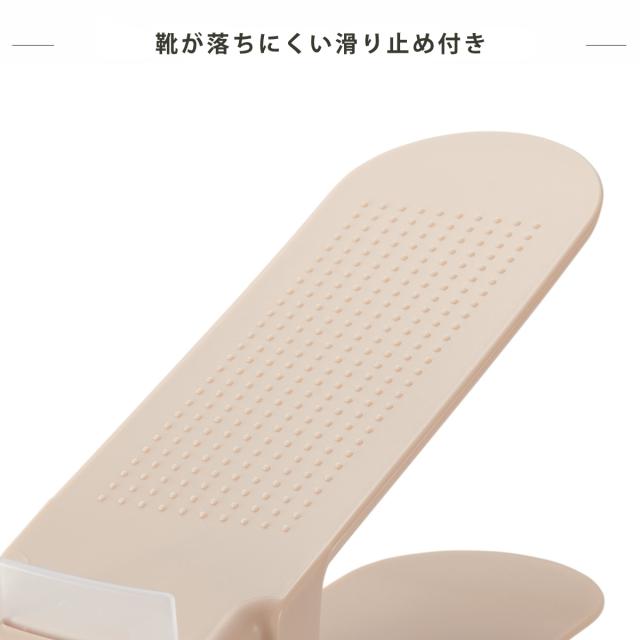 靴底が当たる面に粒状の滑り止め加工があり、横滑りを防止します。ヒールのある靴でも安心してご収納いただけます。