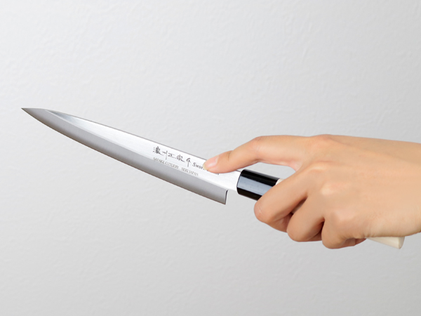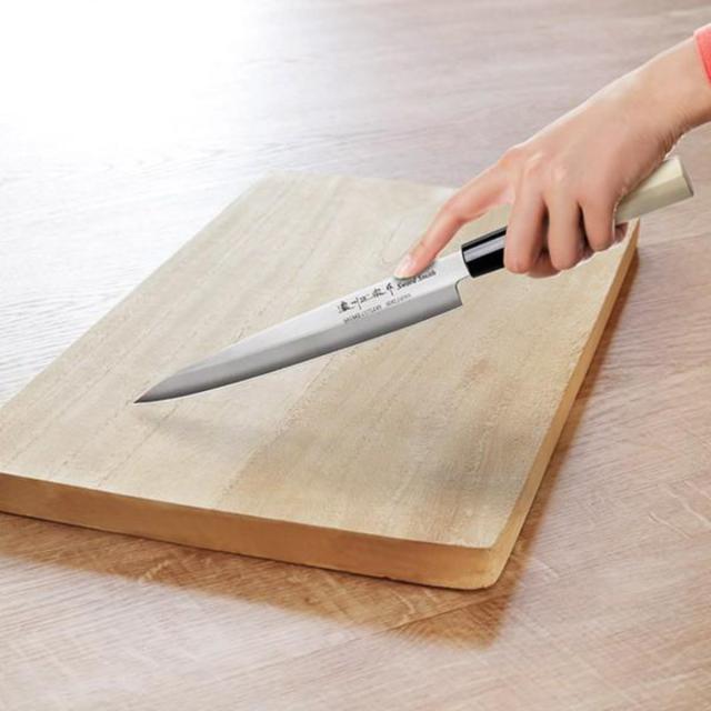 刺身を切り身で買うより、ブロックで買う方がお安くなります。その時に必要なのが、刺身包丁です。普通の三徳包丁でも切れますが、切り口が全然違い、口に入れた時に違いが分かります。繊維を傷付けない口当たりの良さは、刺身包丁でしか出すことができません。