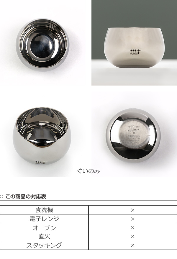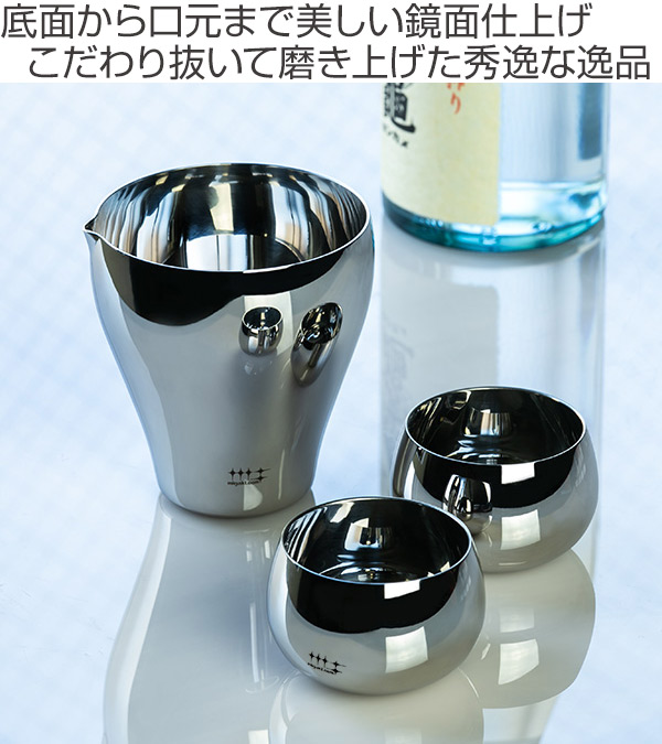 注ぎやすい形状の片口(約350ml)と、ころんと丸みのあるぐいのみ(約100ml×2個)のセットです。ピカピカと美しい鏡面仕上げの酒器で、自宅にいながら高級感のある雰囲気を味わえます。