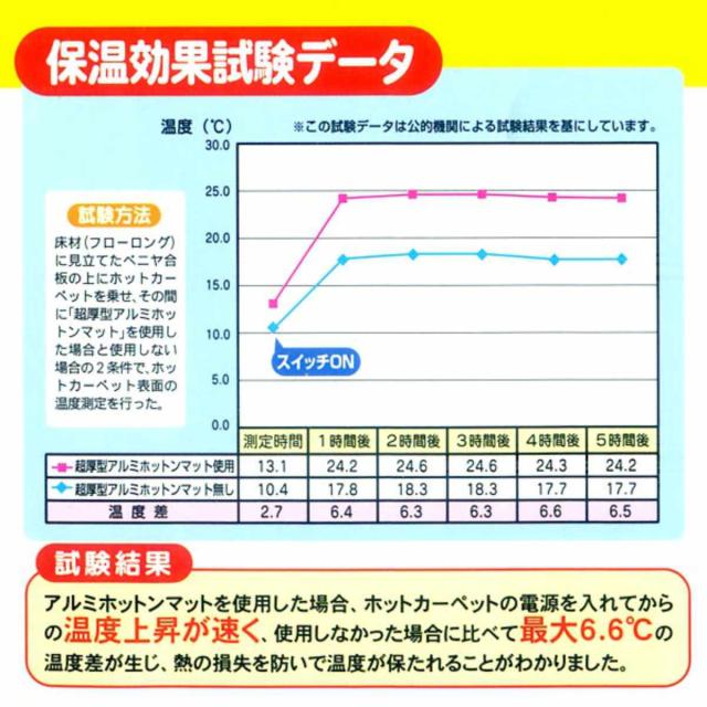 アルミホットンシートを使用した場合、ホットカーペットの電源を入れてからの温度上昇が速くなります。使用しなかった場合に比べて最大6.6度の温度差が生じ、熱の損失を防いで温度が保たれることがわかりました。