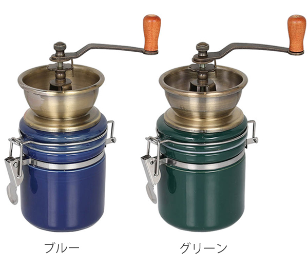 《 手挽きコーヒーミル 豆 挽くやつ カフェ 自宅用 来客用 ギフト プレゼント 贈り物 お祝い コーヒー好き 珈琲 使いやすい 人気 おすすめ シンプル キャンプ アウトドア グランピング ガラス製 Instagram インスタ 映え 緑 青 A715-888ABL A715-888FGN 》