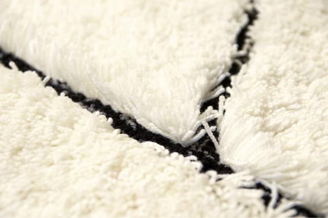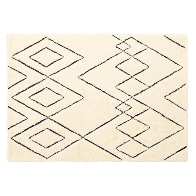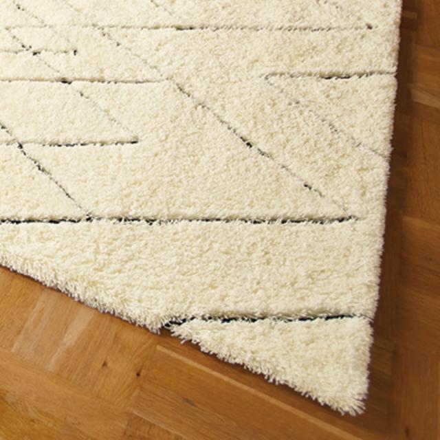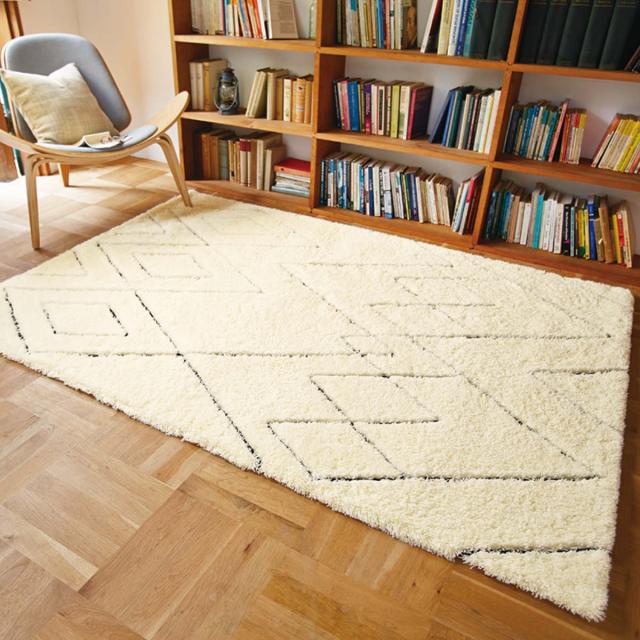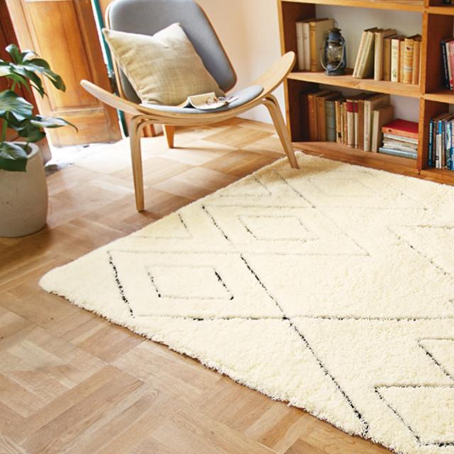 シンプルで素朴な風合いが人気のベニワレン風デザインのラグです。幾何学模様が程よいアクセントとなり、お部屋全体を引き締めてくれます。