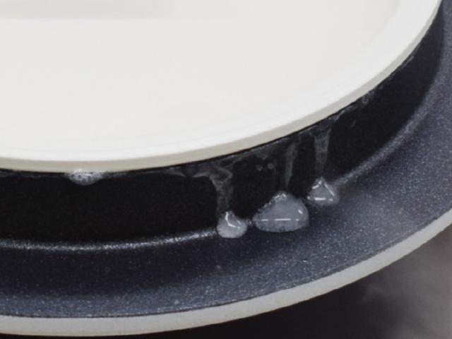 釜は、ツバが広く、吹きこぼれを受け止めるデザインになっています。ツバ上までふっ素樹脂加工を施してあるため、汚れがこびりつきにくく、お手入れも簡単です。