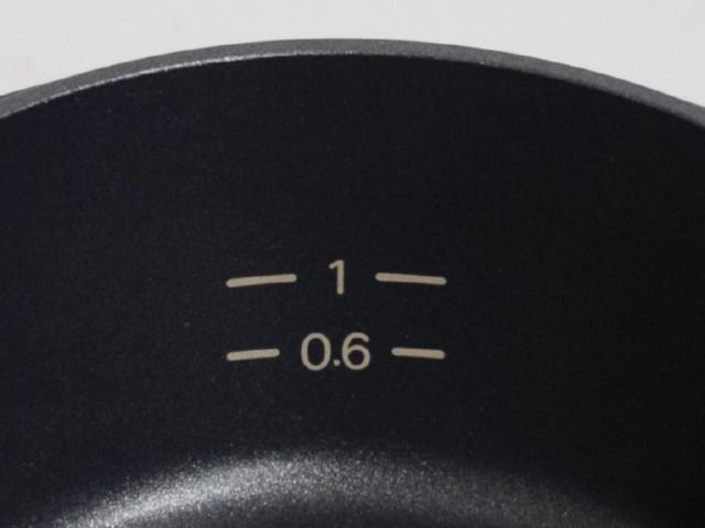 内側には、1合炊きと0.6合炊きの便利な水量目盛りが付いています。