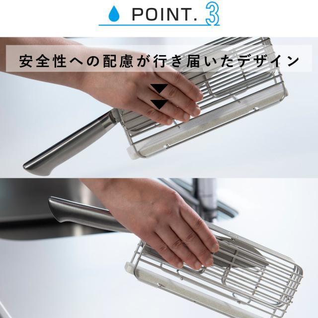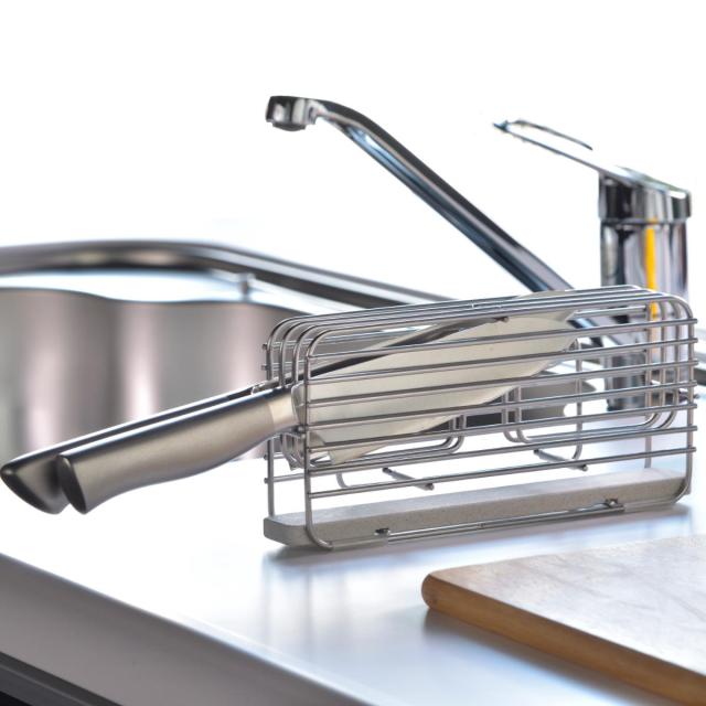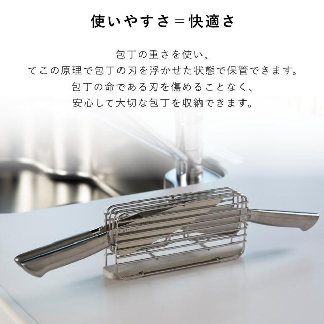 本体のワイヤーの配置は、使いやすさや包丁の保護などは勿論、安全性についてもしっかりと考え抜いたデザインとなっております。例えばワイヤーの隙間は人の指が入りにくいよう、細かな間隔の調節を行っています。また、包丁スタンドを動かす際や、水切りに取り付ける際など、包丁を差し込んだままスタンドを多少傾けても包丁が落下しにくいように設計されています。