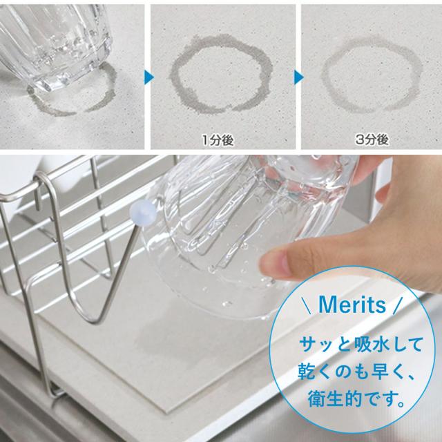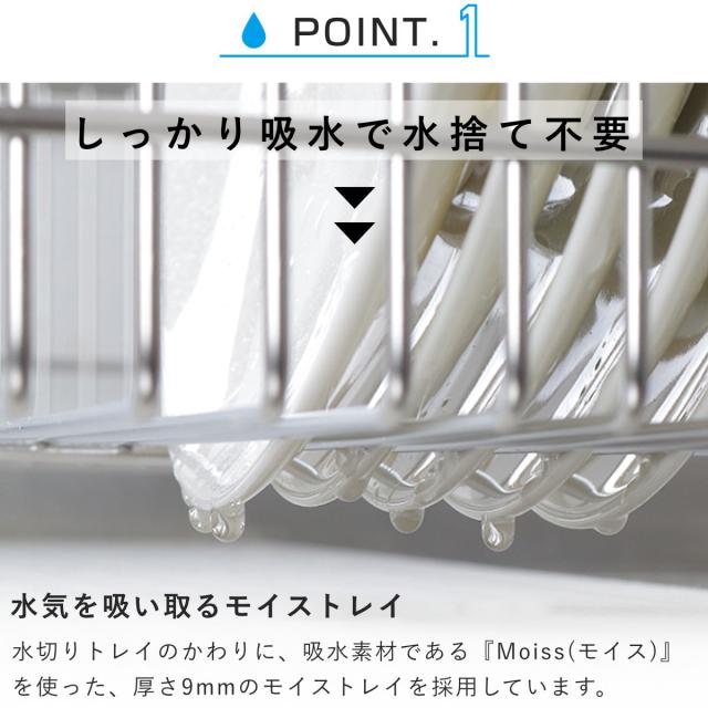 モイストレイは洗い物から落ちた水滴をサッと吸収し、徐々に空気中に放出してくれます。水が溜まらないのでシンクに流す手間が省ける上、水垢やぬめりが付く心配もなく、お手入れ楽々。