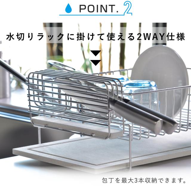 この包丁スタンドは省スペースで設置ができる自立型です。また、背面についたフックを使って水切りラックに取り付けることで、新たに置く場所を作らなくても設置できます。省スペースなスリムなボディですが刃渡り12〜20cmの幅広いサイズに対応しているほか、反対側にも差し込めるので、包丁を最大3本収納できます。