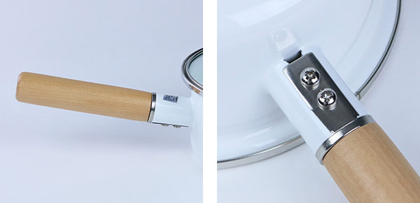 熱くならずに片手でもしっかり持てて手に馴染む天然木製の取っ手は、シンプルなデザインに温かみをプラスします。しっかりとした金具で取り付けられているので、長く使っても外れる心配もありません。