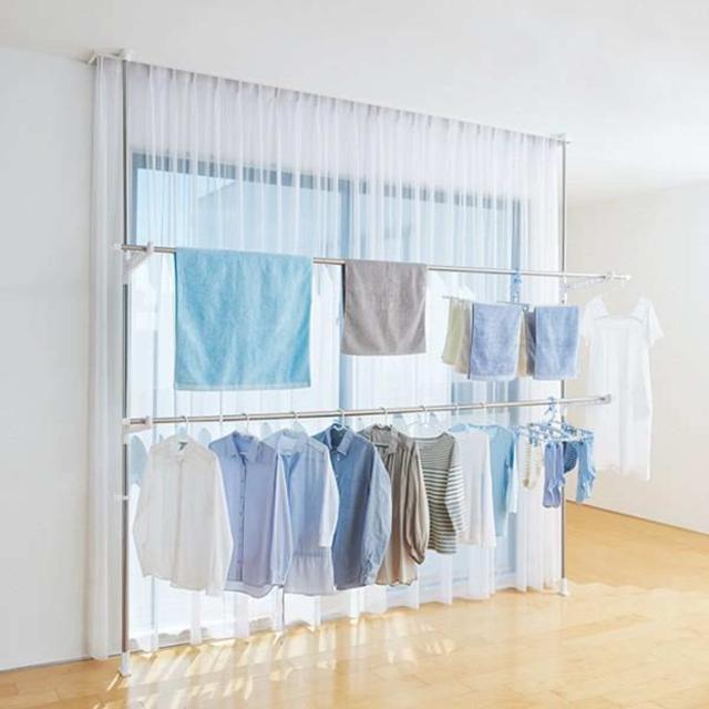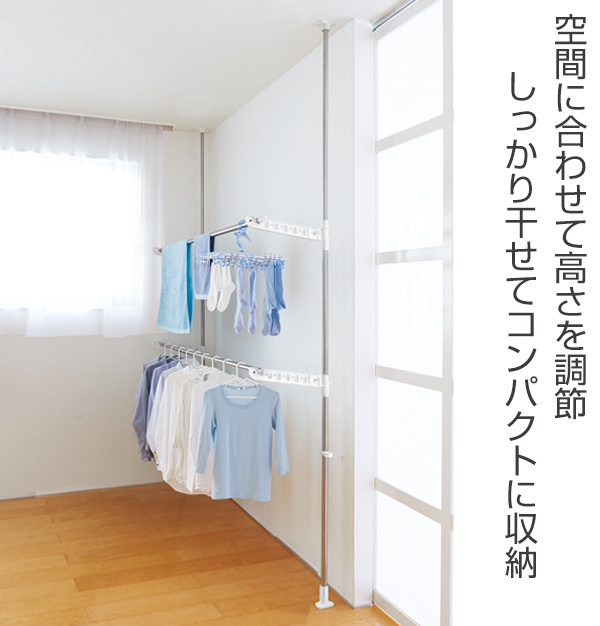 室内で使える突っ張り式の物干しです。竿を2本かけることができます。支柱の高さは約201cm〜最大300cmの間で伸縮ができるので、高い天井のお部屋でもしっかり設置ができます。ネジ・クギなどを使わず簡単に設置できるので、床や天井にも優しい設計です。