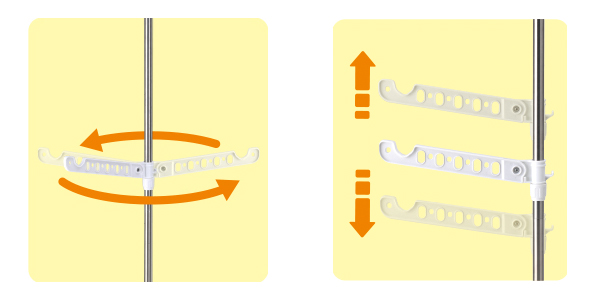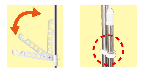 | 360度回転 竿受け部分は360度回転するので、自由に向き調節することができます。 | 位置を調節できる竿受け 竿受けの位置を、干す量や設置場所によって自由に調節可能です。 |