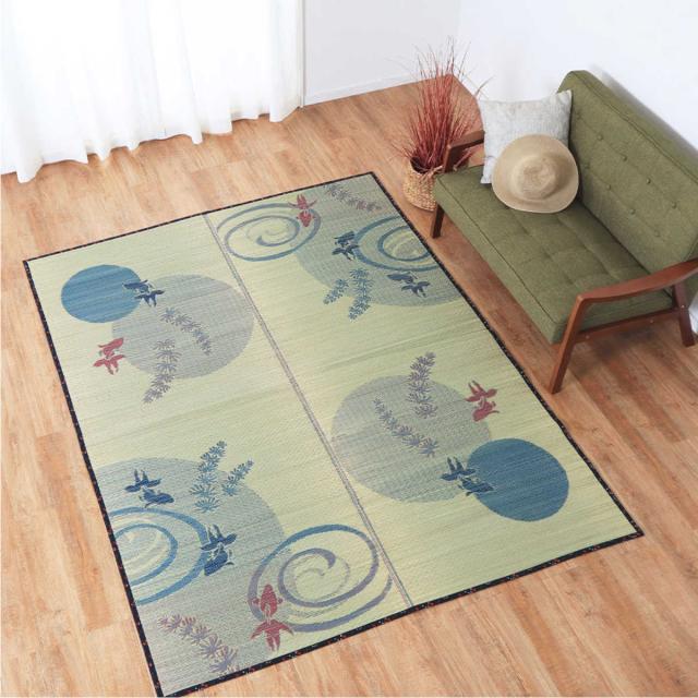 金魚と水紋をあしらったデザインは、サラリとした手触りが涼しさを演出します。2畳用のサイズはラグとして部分敷気にも使えるサイズです。畳の気になる箇所だけ敷いたり、フローリングの上にラグの代わりに敷いたり、様々なシーンにお使いいただけます。