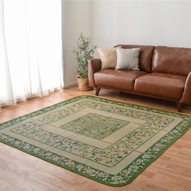 上質な国産い草のみを使用した、い草ラグです。い草の「染」にもこだわり、職人の業で鮮やかな色合いに染め上げました。色鮮やかな花柄がお部屋を明るく華やかに彩り、上質な空間へと導きます。