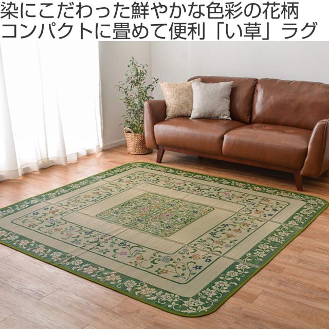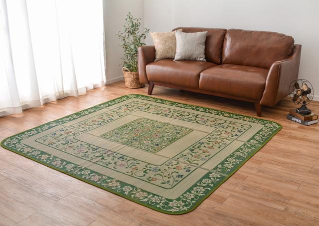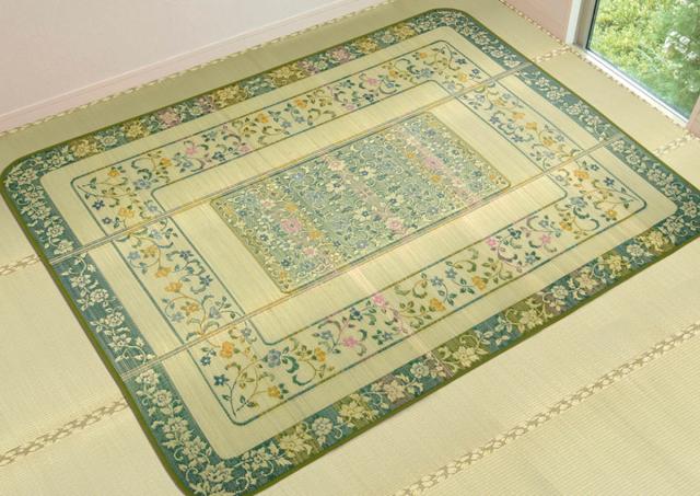 上質な国産い草のみを使用した、い草ラグです。い草の「染」にもこだわり、職人の業で鮮やかな色合いに染め上げました。色鮮やかな花柄がお部屋を明るく華やかに彩り、上質な空間へと導きます。