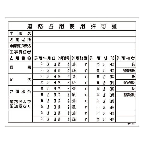 標識 工事用標識 許認可標識板 「道路占用使用許可証」 工事-106 40×50cm ( 工事用 工事 工事現場 表示 表示プレート )