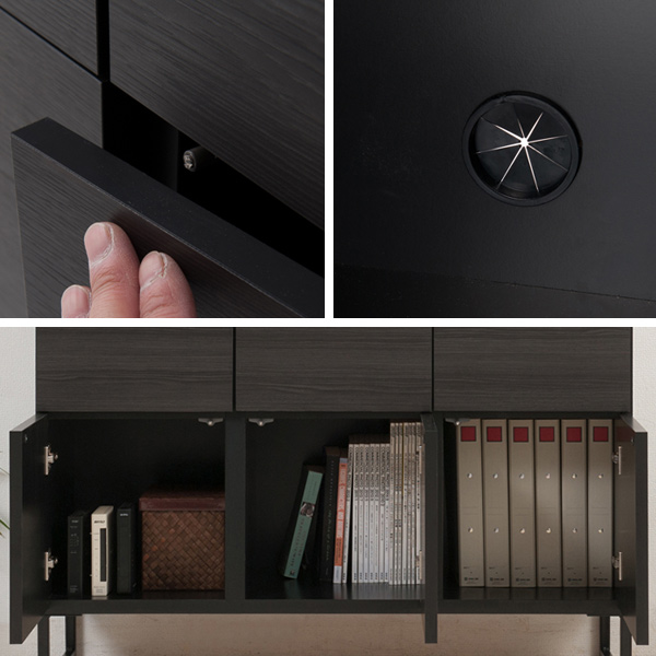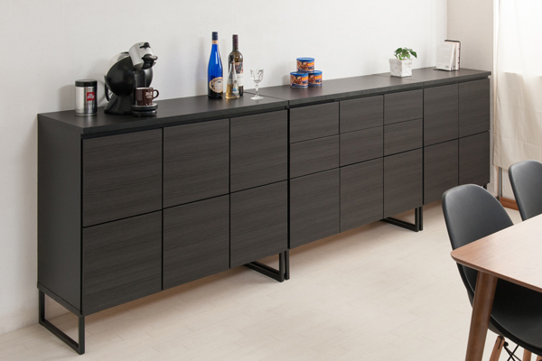 オールブラックで仕上げられたキャビネットは風格のある存在感を放ちます。スチールの脚で床上に適度な空間を作ることで重厚感を和らげ、リビングをシックにかっこよく演出してくれます。