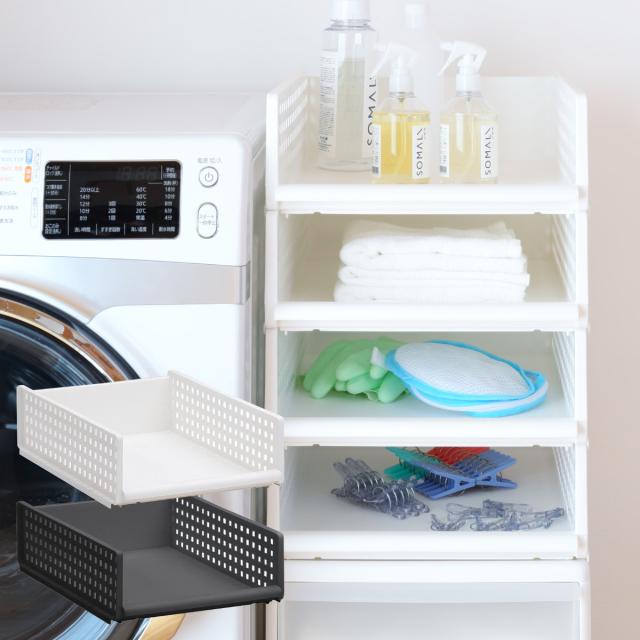 幅が同じ引き出しや、バスケットともスタッキングができるので、省スペースで大容量の収納が可能です。