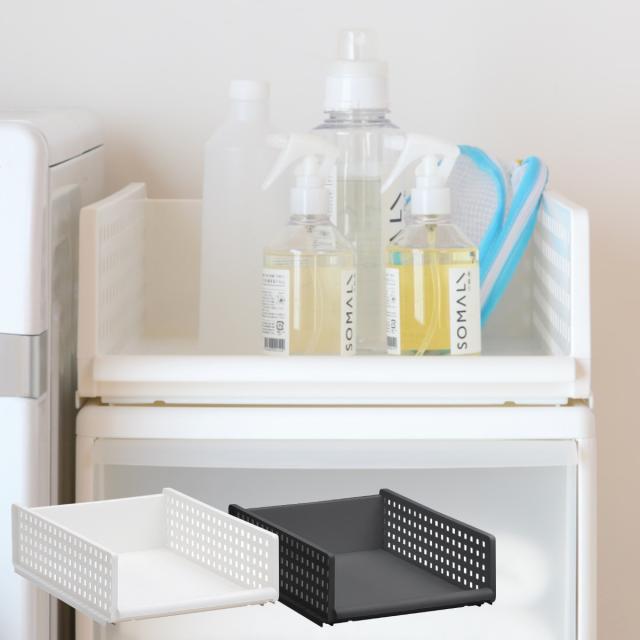 幅が同じ引き出しや、バスケットともスタッキングができるので、省スペースで大容量の収納が可能です。