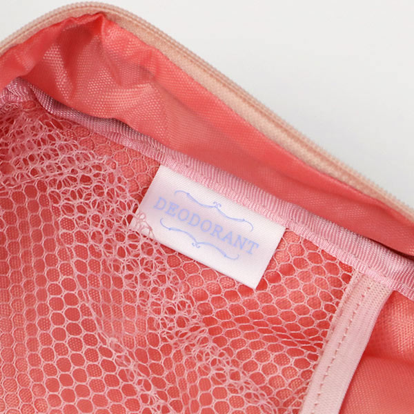 中身が取り出しやすいメッシュポケットがあるので、通気性がよく、化粧水などがごちゃ付かずに収納できます。クリアポケットは、ファスナー付なので、細かい物も無くさずに、持ち歩きが可能です。