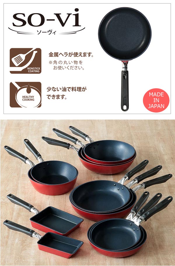 軽い、強い、使いやすい、熟練職人がひとつひとつ丁寧に造っている日本製フライパン「ソーヴィ」シリーズです。側面は薄く、軽量化し蓄熱性に優れた厚底で、お料理をムラなく加熱します。20cm〜30cmまで豊富なサイズ展開なので用途に合わせてお選びいただけます。お弁当用から普段使い用や作り置き用にサイズ違いで揃えることで毎日の料理がより快適になります。