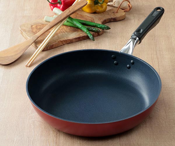 フライパンの内面は、キズに強いハイグレードの耐久性を誇るテフロンプラチナ加工が施されており、金属ヘラも使えます。また焦げ付きにくく、お手入れも簡単です。