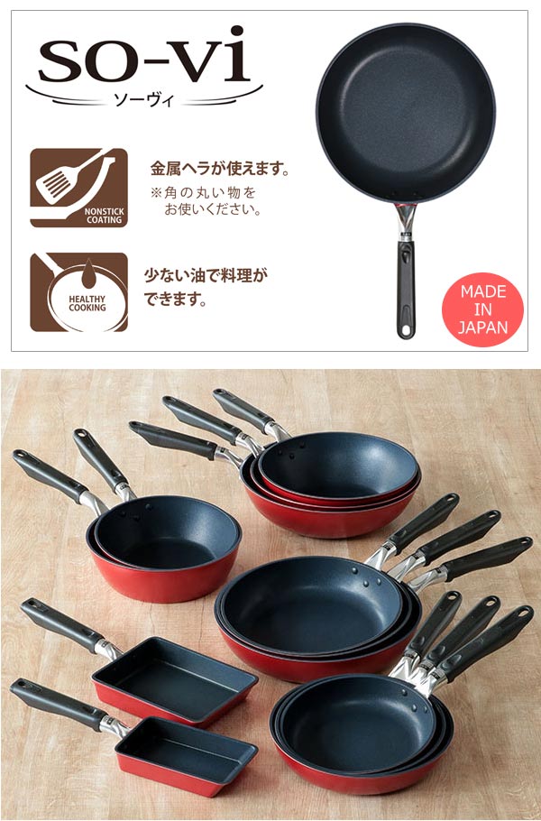 軽い、強い、使いやすい、熟練職人がひとつひとつ丁寧に造っている日本製フライパン「ソーヴィ」シリーズです。側面は薄く、軽量化し蓄熱性に優れた厚底で、お料理をムラなく加熱します。20cm〜30cmまで豊富なサイズ展開なので用途に合わせてお選びいただけます。お弁当用から普段使い用や作り置き用にサイズ違いで揃えることで毎日の料理がより快適になります。