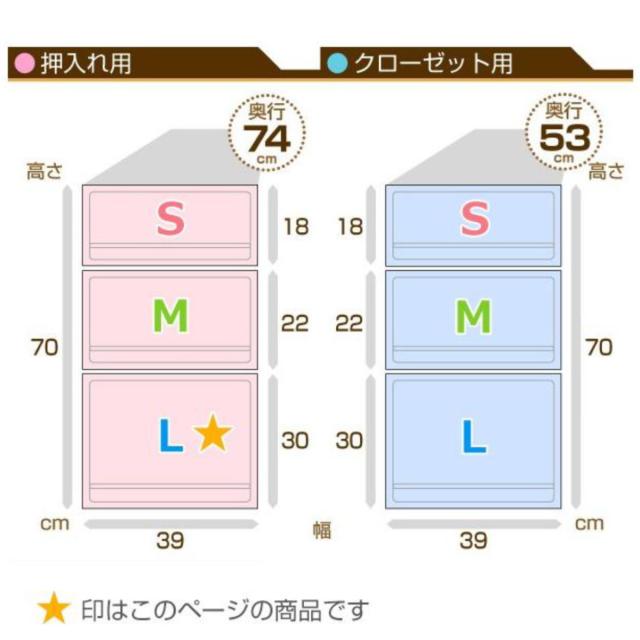 | ●押入れ用 S(幅39×奥行74×高さ18cm) M(幅39×奥行74×高さ22cm) L(幅39×奥行74×高さ30cm) | ●クローゼット用 S(幅39×奥行53×高さ18cm) M(幅39×奥行53×高さ22cm) L(幅39×奥行53×高さ30cm) |