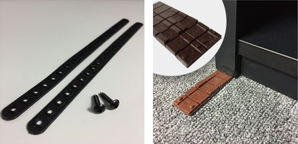 | 転倒防止バンド 地震などに備えて本体を壁面に固定する転倒防止バンドが付属しています。 | 前倒れ防止スペーサー 前面への転倒防止のため、バランスボードを側板の底面に差し込んでご使用ください。 |