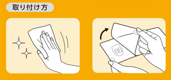 | 1 吸着シートを貼り付ける面の汚れを取り除き、よく乾かしてください。 | 2 吸着シート裏面の保護フィルムをはがして、気泡が入らないように注意しながら水平に貼り付けてください。 |