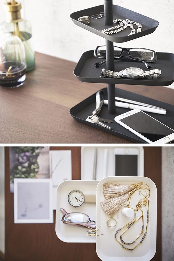 各段のトレーは向きを好みの位置で固定することができます。「手に取りやすい向きで固定」、「向きを変えておしゃれに演出」自分好みに使用できるアクセサリートレーになっています。