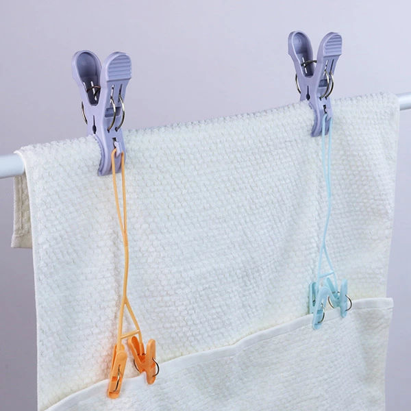 ひもの先にピンチが2個付いている、同シリーズの「ペアピンチひも付」を厚物フィットピンチの両サイドにあるフックに通せば、長い洗濯物も床に着くことなく干すことができます。隠し干しにもピッタリです!