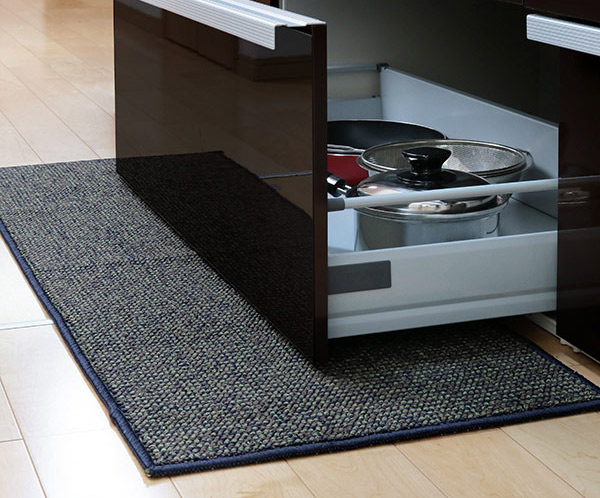 システムキッチンの一番下の引き出しも引っかからない、約6mmの厚みです。お掃除ロボットにも引っかかりにくいです。